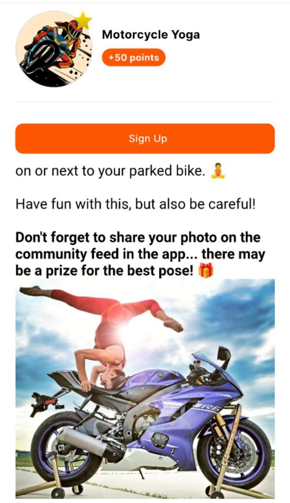 洗車する!・オイル交換!(お店でしてもらっても大丈夫)などのメンテナンスをするチャレンジもあれば…「え!ヨガ!?」なんてのもあります。